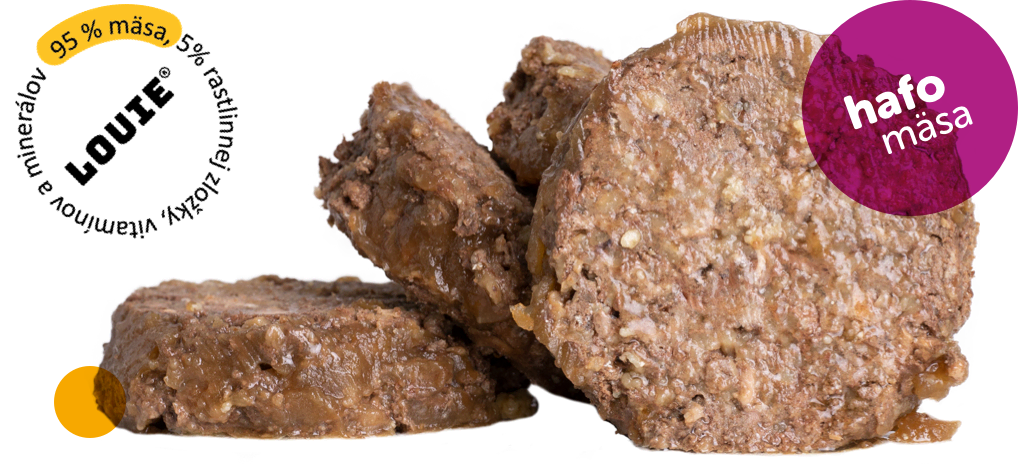 Uloviť mäsoLouieho kompletné krmivá obsahujú 95% mäsa v pevnej zložke, ktoré v kombinácii s 5% rastlinnej zložky a prírodného komplexu vitamínov a minerálov perfektne napodobňujú zviera, ktoré by pes alebo vlk ulovil v prírode! Navyše neobsahuje žiadne konzervanty, dochucovadlá ani ďalšiu zbytočnú chémiu!