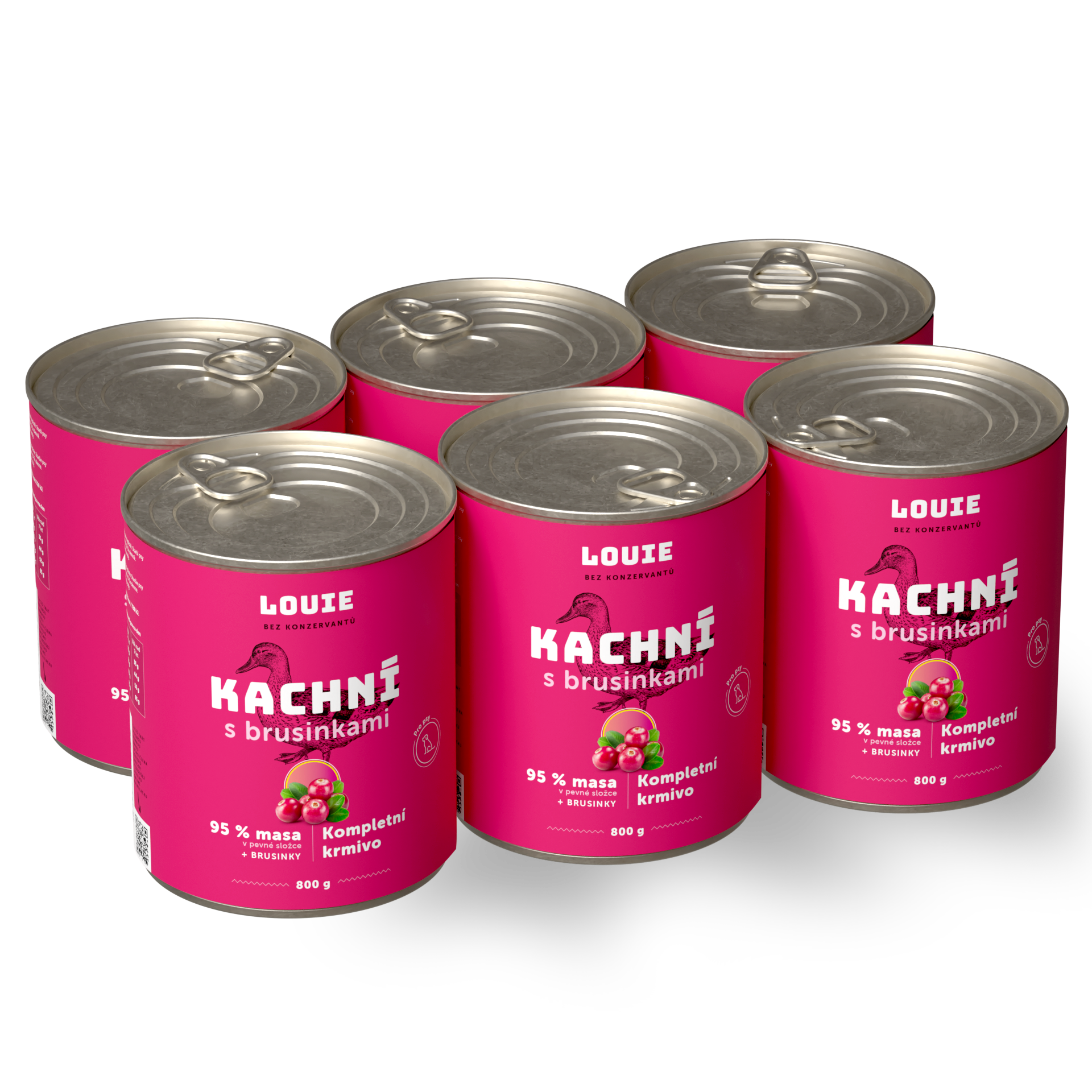 Šťavnatá konzerva obsahuje 95% mletého kačacieho mäsa v pevnej zložke. Okrem mäsa sú v konzerve aj zmäkčené kačacie kosti, ktoré sú prírodným zdrojom vápnika a fosforu rovno v prirodzenom pomere a brusnice slúžiace ako doplnok na podporu peristaltiky čriev a simuláciu minoritnej rastlinnej zložky v potrave psov.
