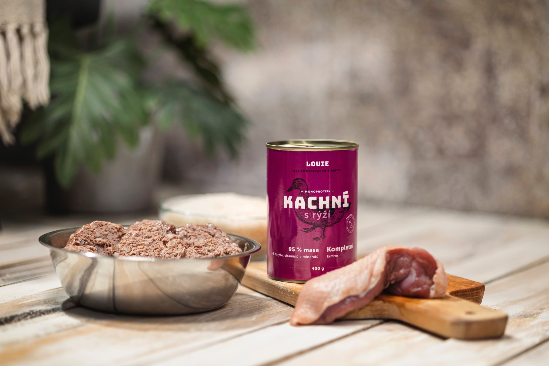 Tak, ako keď pes uloví sliepku alebo vlk uloví ovcu a skonzumuje ju celú, vrátane kostí a obsahu tráviaceho traktu (čím získa aj malú časť rastlinnej zložky do svojho jedálnička), tak aj Louie vymýšľa receptúry svojich kompletných mäsových konzerv pre členov svojej svorky tak, aby bol obsah konzerv čo najpodobnejší ulovenému zvieraťu!
