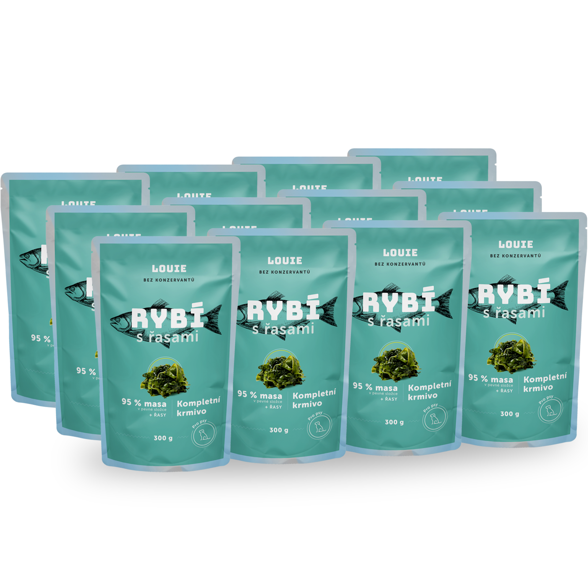 12x Rybie kapsička s riasami 300g: rybie mäso, vývar, zmäkčené rybie kosti, riasy (spirulina), minerály a vitamíny.