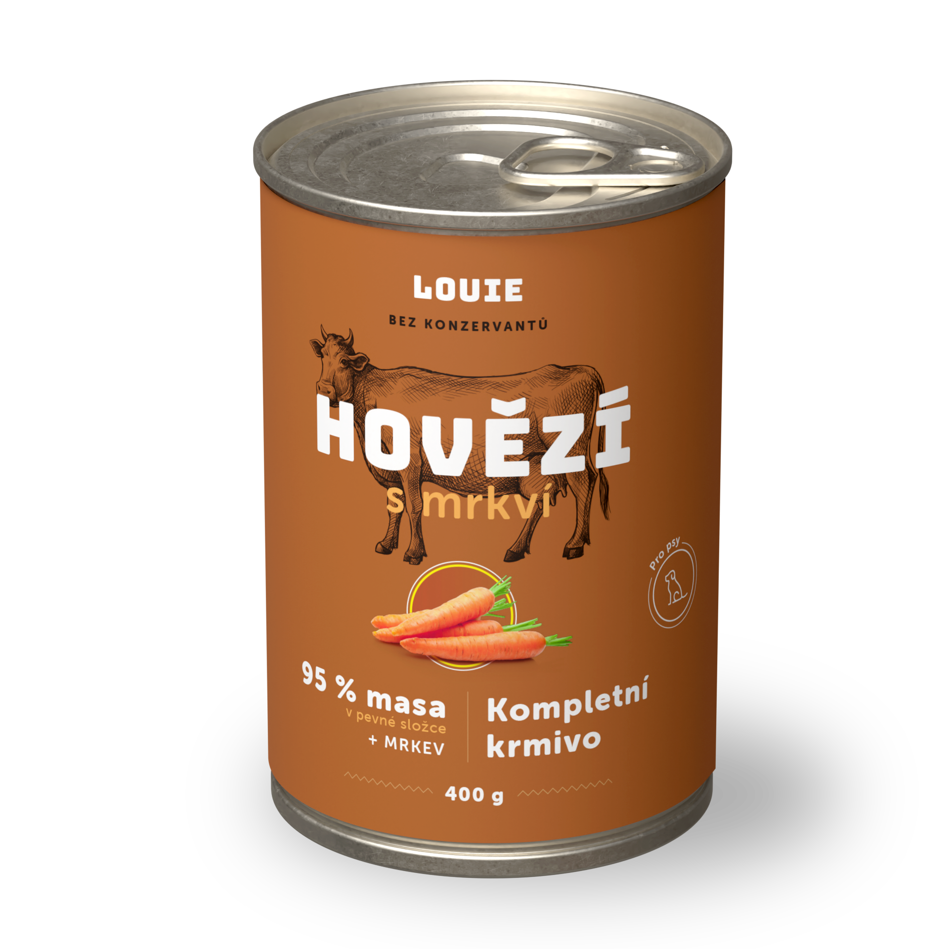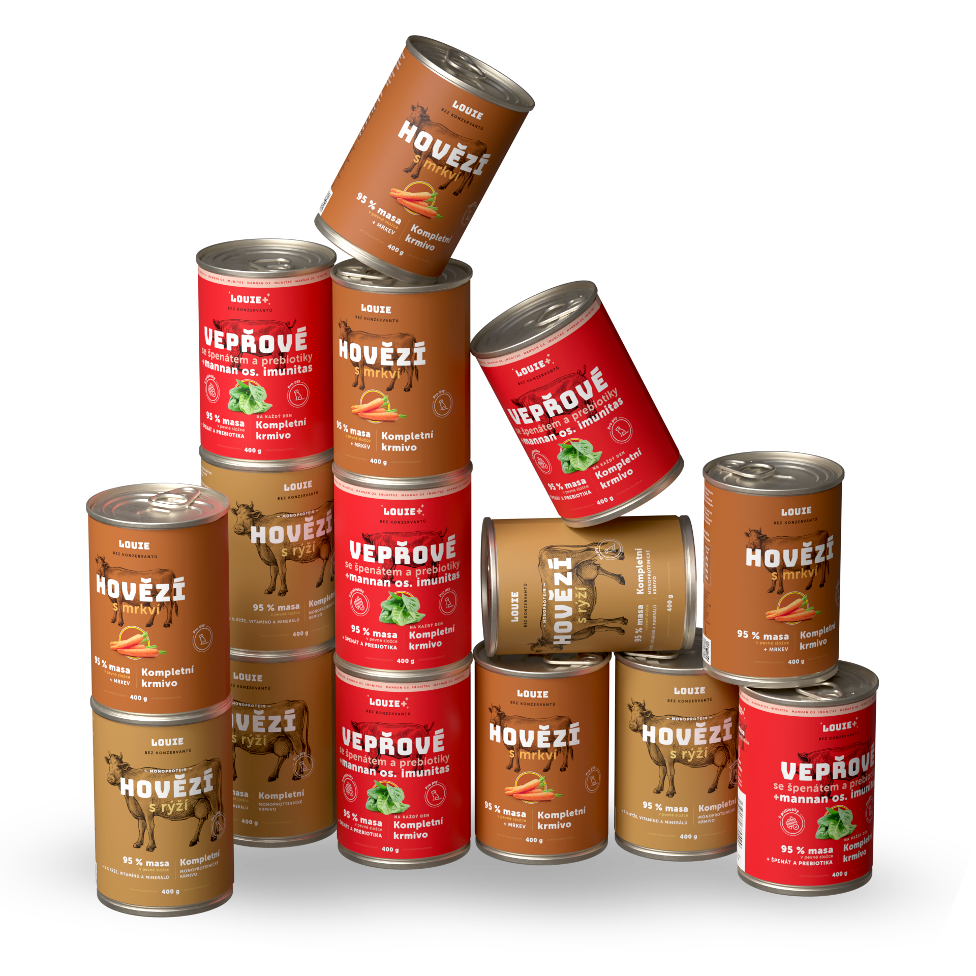95 % šťavnatého a voňavého MASA v pevnej zložke a 5 % Louieho mixu rastlinnej zložky, vitamínov a minerálov v kompletných krmivách Louie perfektne napodobňuje bylinožravca, ktorého by psovitá šelma v prírode ulovila a zožrala.