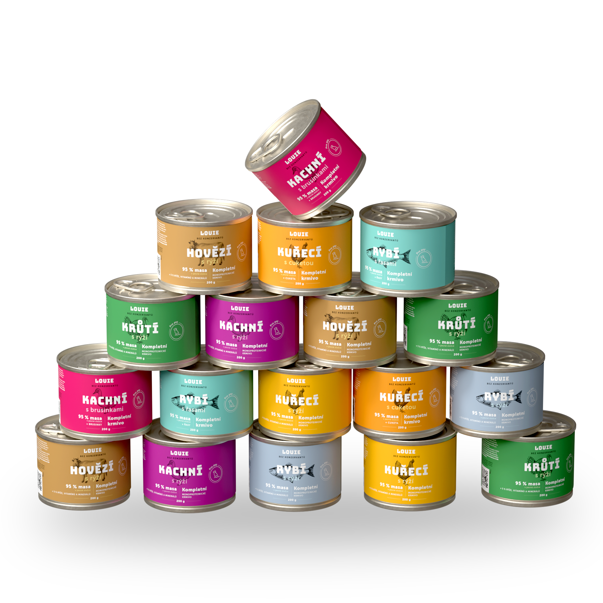 Stále premýšľaš, ktorú z Louieho konzerv ochutnať ako prvú? V balíčku nájdeš mix 18 konzerv, ktoré obsahujú 95 % mäsa v pevnej zložke a 5 % rastlinnej zložky, vitamínov a minerálov.