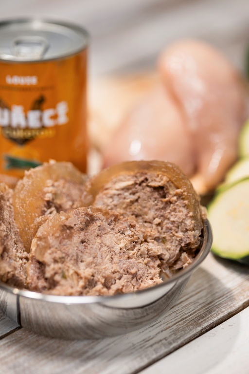 Kuracie s cuketou 400g: Kuracie mäso, vývar, zmäkčené kuracie kosti, cuketa, vitamíny a minerály. Analytické zložky: hrubý proteín 11,5%, hrubý tuk 12%, hrubý popol 1%, hrubá vláknina 0,5%, vlhkosť 75%.