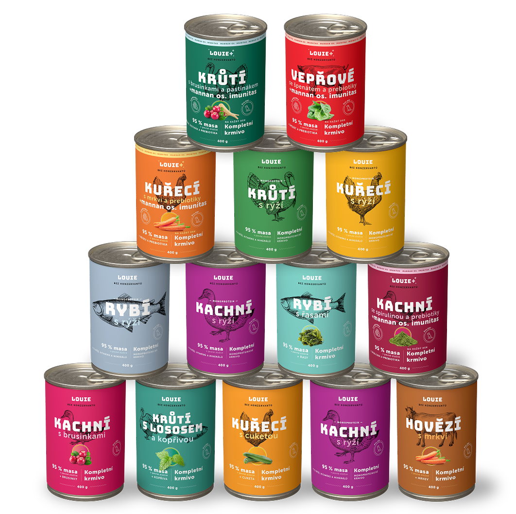 Stále premýšľaš, ktorú z Louieho konzerv ochutnať ako prvú? V balíčku nájdeš mix 14 konzerv , ktoré obsahujú 95 % mäsa v pevnej zložke a 5 % rastlinnej zložky, vitamínov a minerálov.