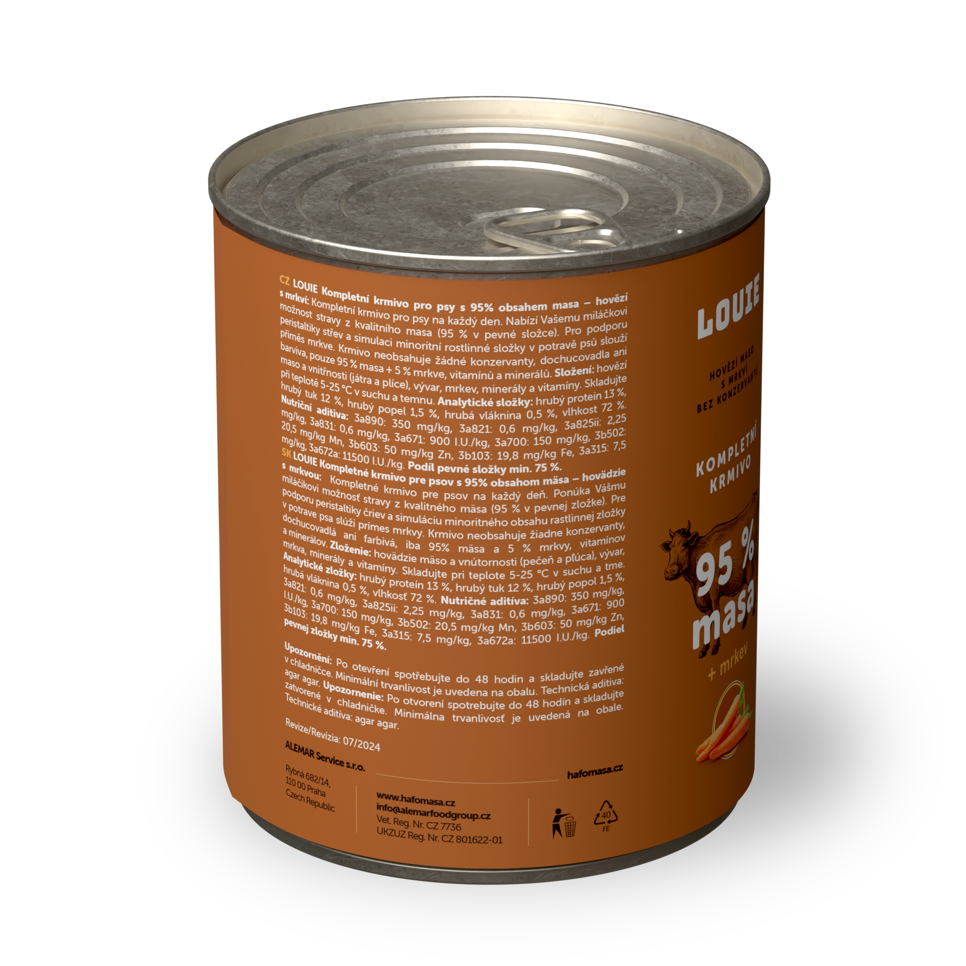 95 % šťavnatého a voňavého MASA v pevnej zložke a 5 % Louieho mixu rastlinnej zložky, vitamínov a minerálov v kompletných krmivách Louie perfektne napodobňuje bylinožravca, ktorého by psovitá šelma v prírode ulovila a zožrala.