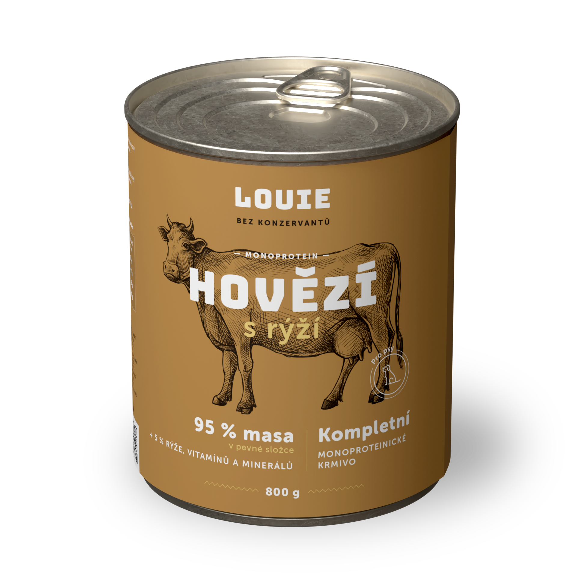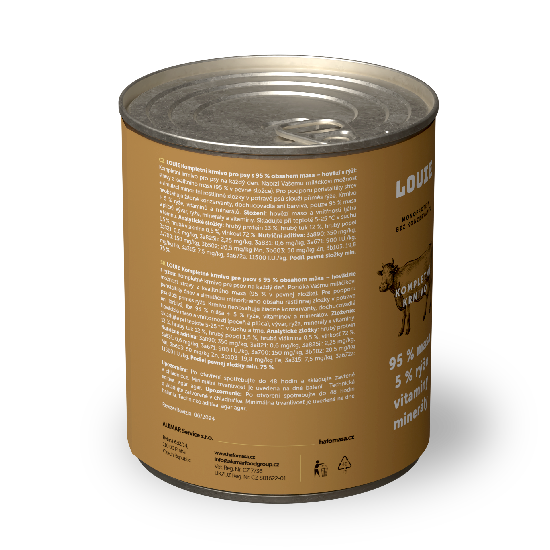 95 % šťavnatého a voňavého MASA v pevnej zložke a 5 % Louieho mixu rastlinnej zložky, vitamínov a minerálov v kompletných krmivách Louie perfektne napodobňuje bylinožravca, ktorého by psovitá šelma v prírode ulovila a zožrala.