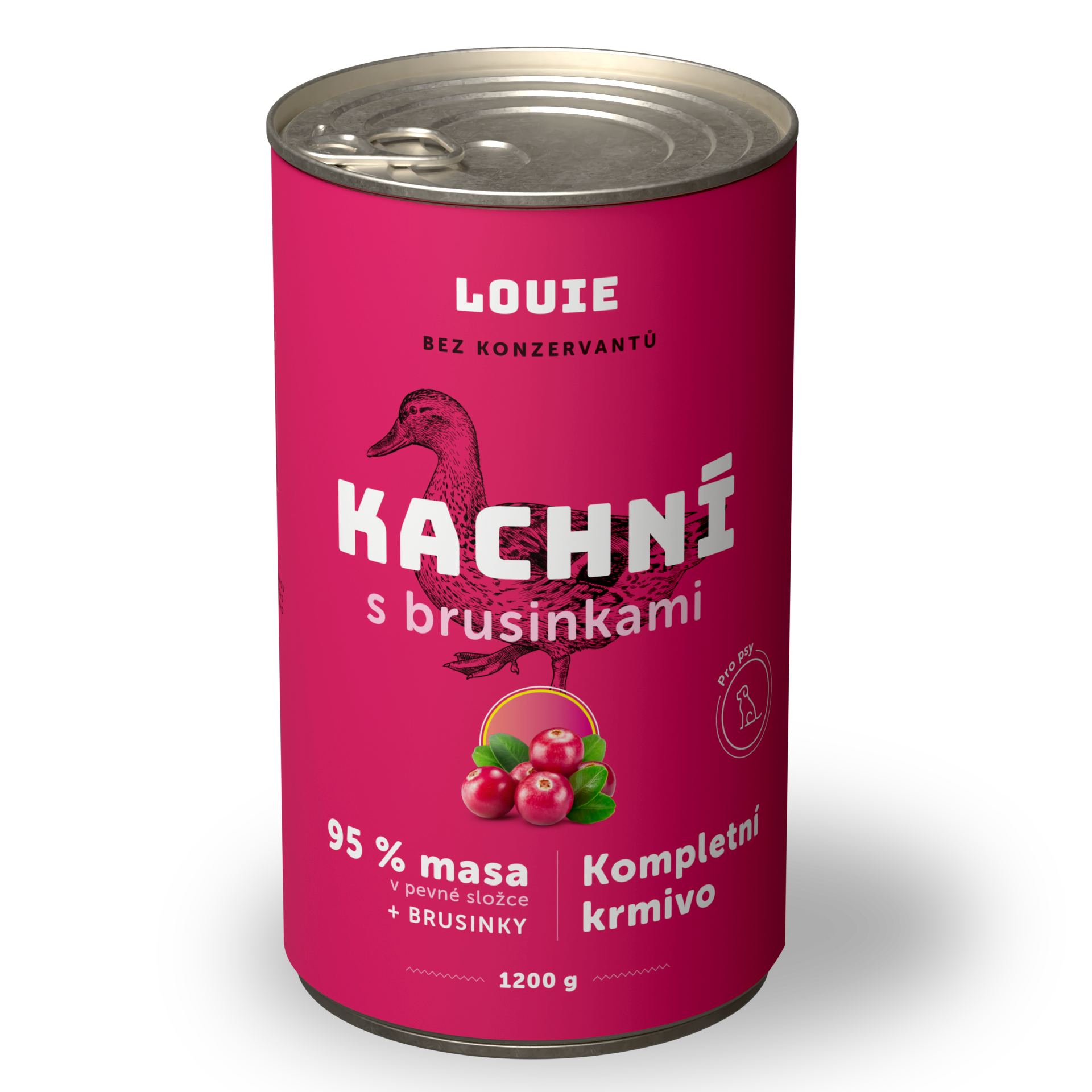 Šťavnatá konzerva obsahuje 95% mletého kačacieho mäsa v pevnej zložke. Okrem mäsa sú v konzerve aj zmäkčené kačacie kosti, ktoré sú prírodným zdrojom vápnika a fosforu rovno v prirodzenom pomere a brusnice slúžiace ako doplnok na podporu peristaltiky čriev a simuláciu minoritnej rastlinnej zložky v potrave psov.