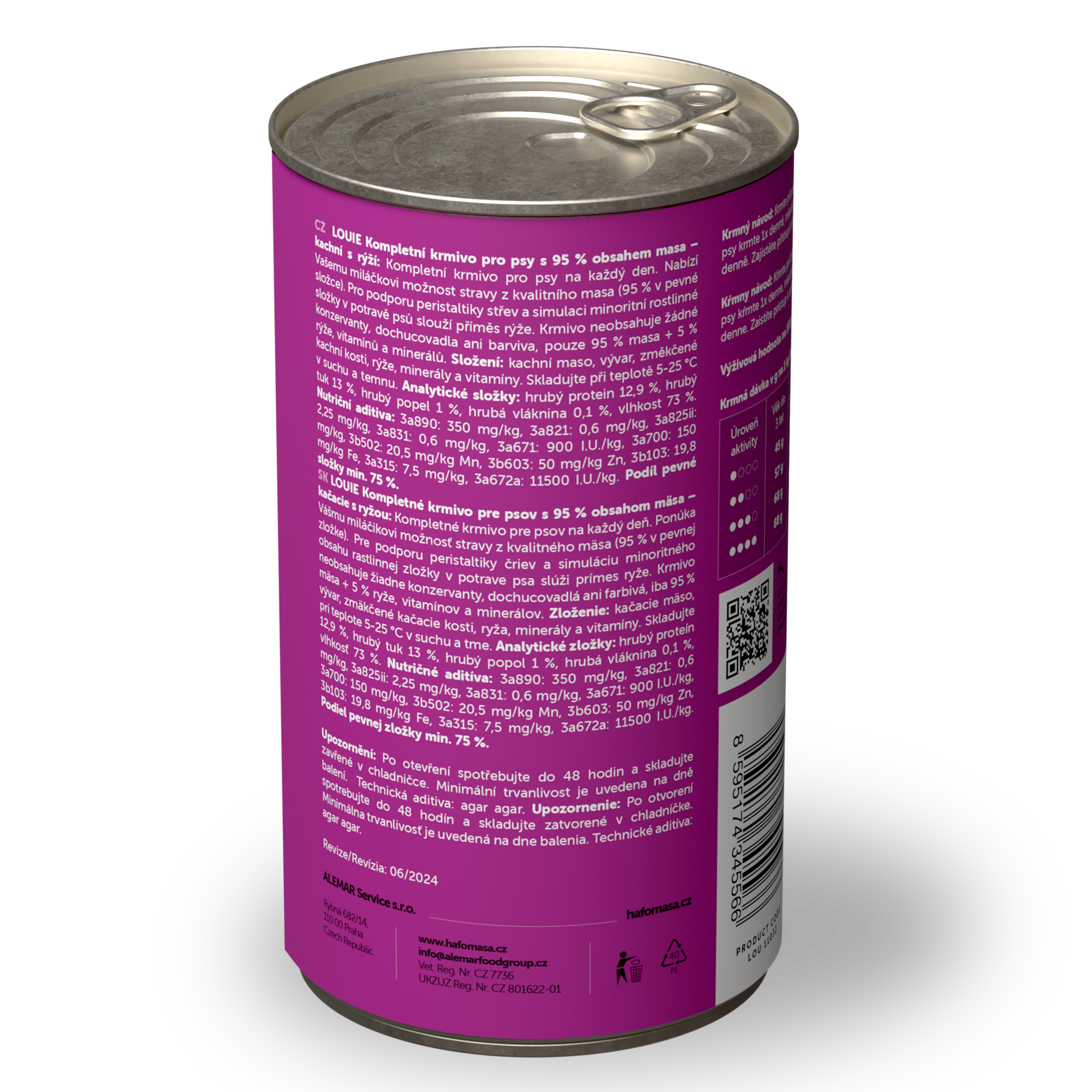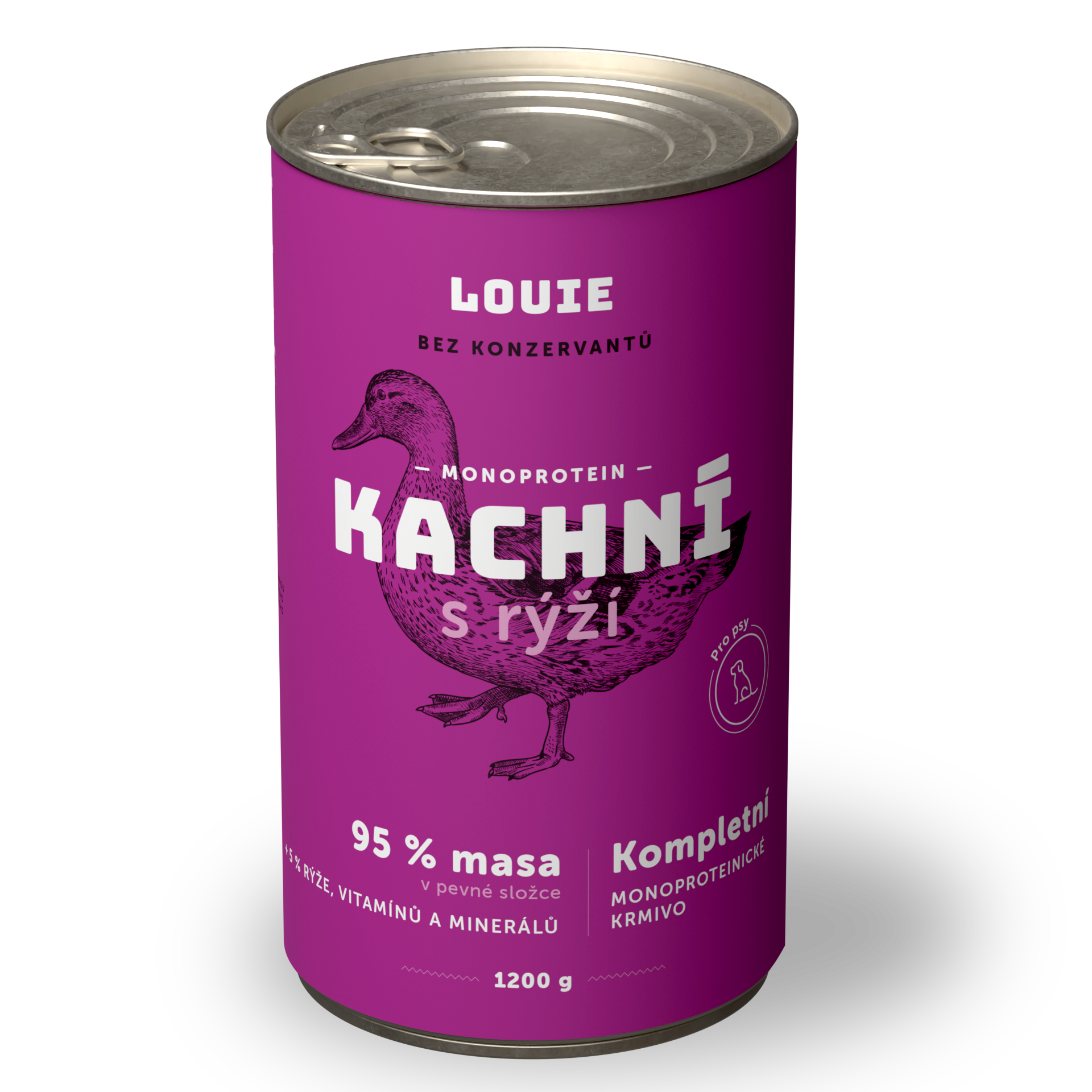 95 % šťavnatého a voňavého MASA v pevnej zložke a 5 % Louieho mixu rastlinnej zložky, vitamínov a minerálov v kompletných krmivách Louie perfektne napodobňuje bylinožravca, ktorého by psovitá šelma v prírode ulovila a zožrala.