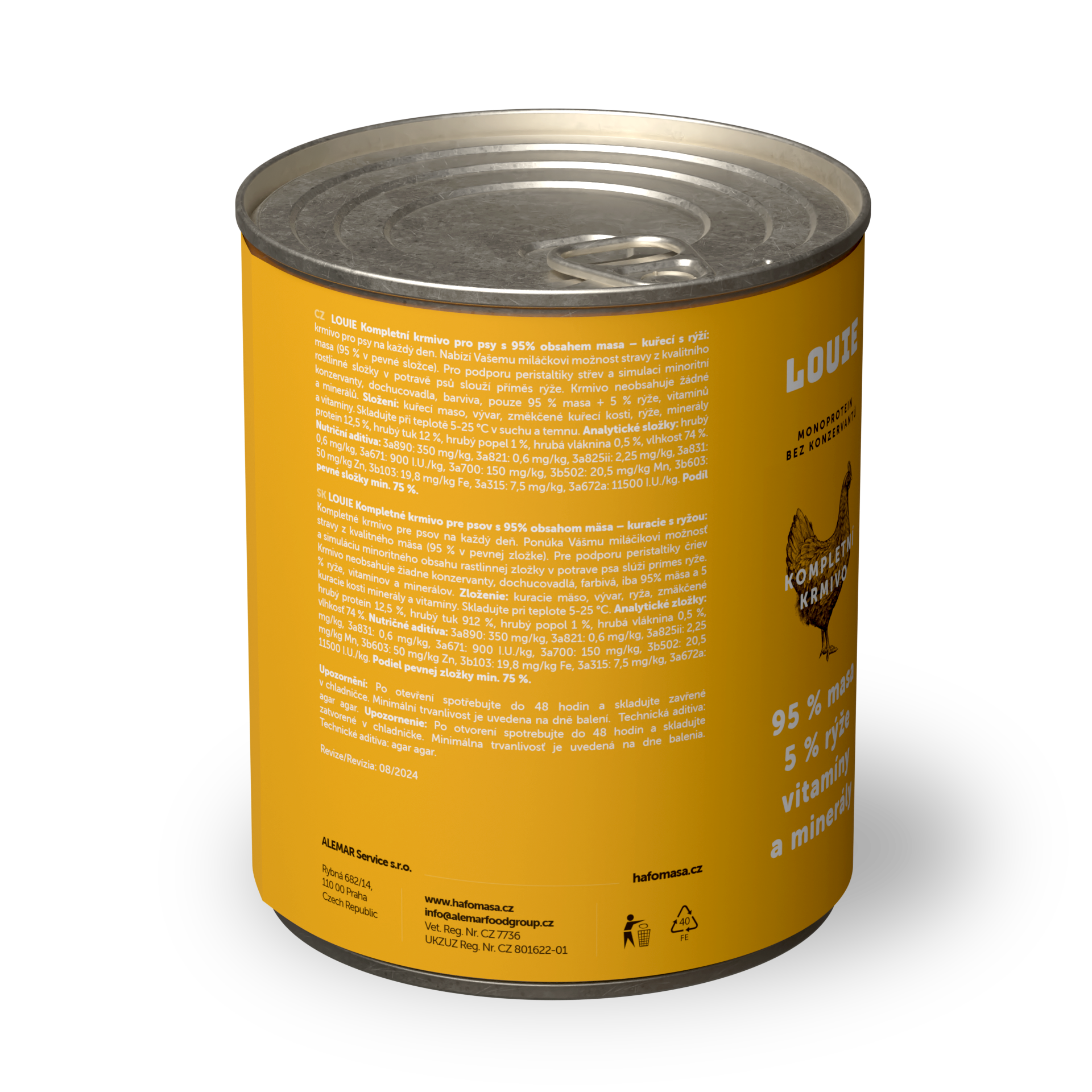 95 % šťavnatého a voňavého MASA v pevnej zložke a 5 % Louieho mixu rastlinnej zložky, vitamínov a minerálov v kompletných krmivách Louie perfektne napodobňuje bylinožravca, ktorého by psovitá šelma v prírode ulovila a zožrala.