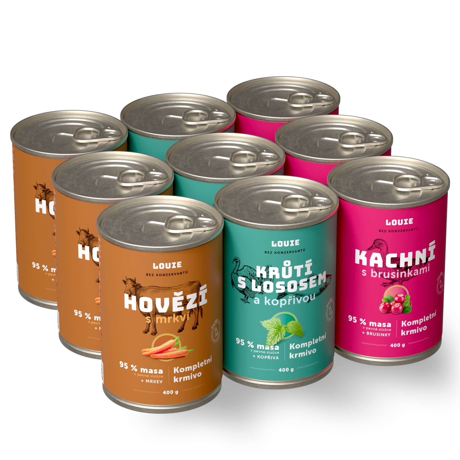 95 % šťavnatého a voňavého MASA v pevnej zložke a 5 % Louieho mixu rastlinnej zložky, vitamínov a minerálov v kompletných krmivách Louie perfektne napodobňuje bylinožravca, ktorého by psovitá šelma v prírode ulovila a zožrala.