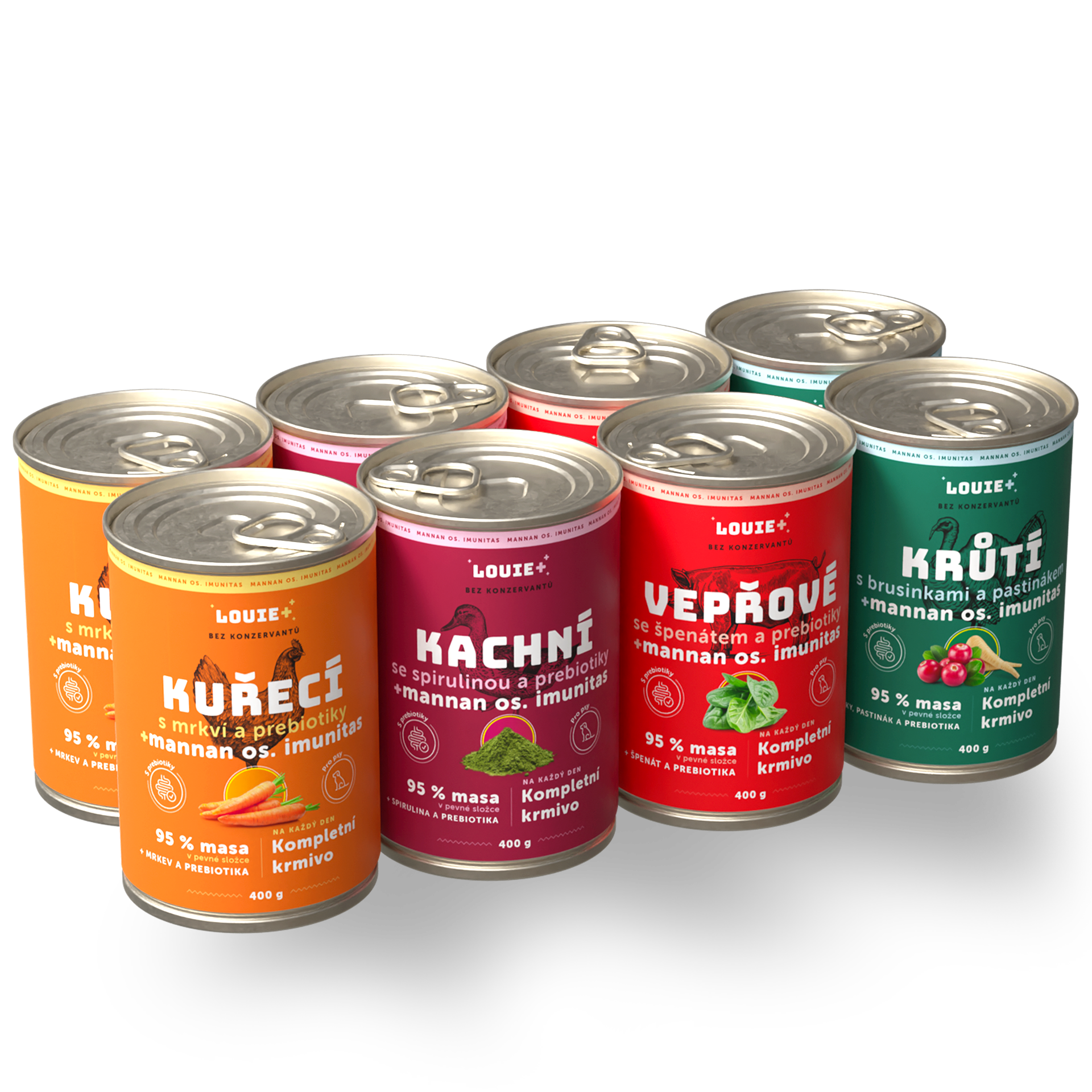 Tak, ako keď pes uloví sliepku alebo vlk uloví ovcu a skonzumuje ju celú, vrátane kostí a obsahu tráviaceho traktu (čím získa aj malú časť rastlinnej zložky do svojho jedálnička), tak aj Louie vymýšľa receptúry svojich kompletných mäsových konzerv pre členov svojej svorky tak, aby bol obsah konzerv čo najpodobnejší ulovenému zvieraťu!