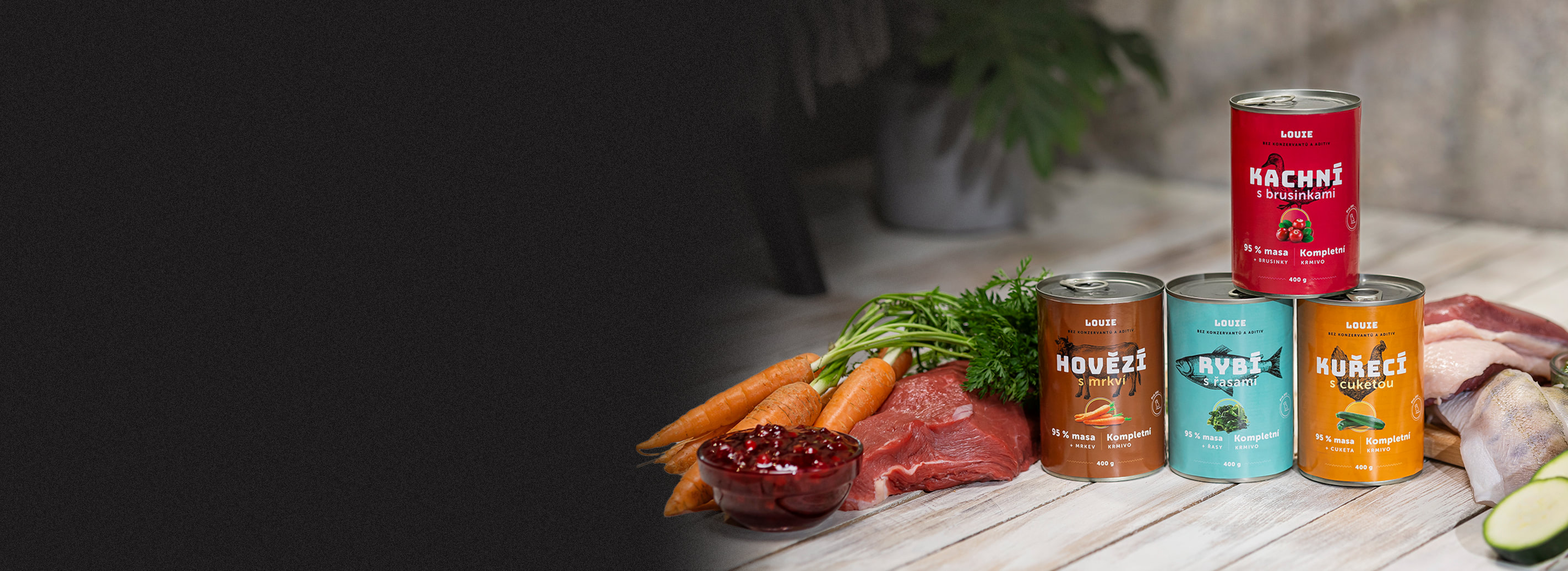 Základ všetkého je MÄSO! A toho dávame 95% v pevnej zložke! Zatiaľ čo sa v dnešnej dobe hocikto hrá na to, že zo psov urobí vegetariánov a kravy nakŕmi mäsokostnou múčkou, Louie také hry nehrá. Najbližší príbuzný psa je vlk a mačky tiger a hoci sem tam zjedia aj trochu rastlinnej stravy alebo ju získajú zo žalúdka ulovené obete, nikto nikdy nevidel vlka, ako by liezol po strome pre jablká…